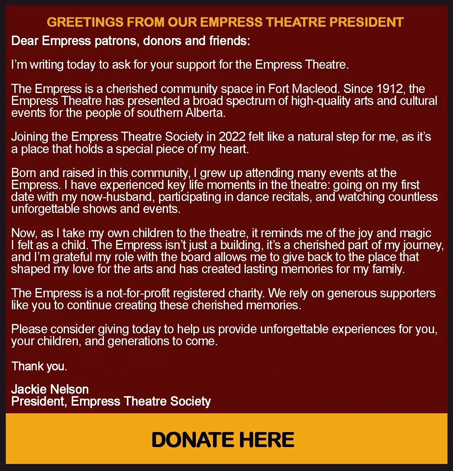 Since 1912 the Empress Theatre has provided a broad spectrum of high quality arts and cultural events to the people of rural Southern Alberta. The Empress is a not-for-profit registered charity that hosts live theatre, world-class music, cinema, summer theatre camps, film festivals, community musicals, weddings, private screenings, conventions, tours, meetings, conferences, symposia, workshops, lectures, debates, rehearsals, memorials, celebrations, benefit concerts, location shoots, live recordings, spiritual experiences, paranormal investigations, parties and more.